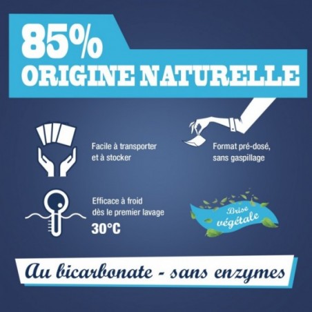 Des feuilles de lessive qui concentrent la juste dose d'efficacité pour un résultat impeccable même à basse température (30°C). Pour concocter cette lessive, nous avons sélectionnée des ingrédients d'origine naturelle dont du Savon noir, un excellent nettoyant et détachant. Une formule sans enzyme qui convient donc à tous types de linge, même le délicat. Un bon geste à adopter pour en finir avec le surdosage et alléger ses épaules ou son sac de course grâce à son format léger, facile à transporter et à stocker.