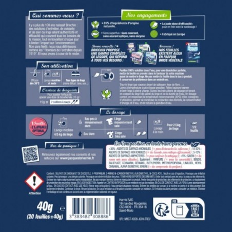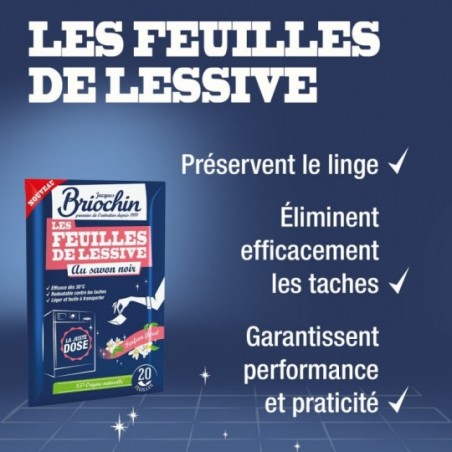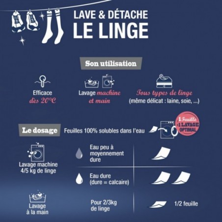 Des feuilles de lessive qui concentrent la juste dose d'efficacité pour un résultat impeccable même à basse température (30°C). Pour concocter cette lessive, nous avons sélectionnée des ingrédients d'origine naturelle dont du Savon noir, un excellent nettoyant et détachant. Une formule sans enzyme qui convient donc à tous types de linge, même le délicat. Un bon geste à adopter pour en finir avec le surdosage et alléger ses épaules ou son sac de course grâce à son format léger, facile à transporter et à stocker.