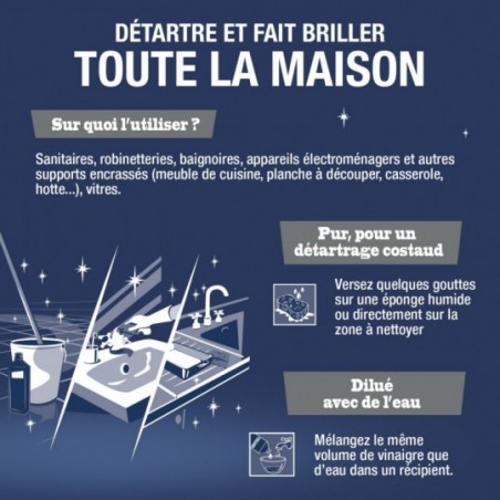 🧽 Il nettoie en profondeur, détartre efficacement et fait briller vos sanitaires, robinetteries, baignoires et appareils électroménagers. Il agit aussi sur les surfaces encrassées comme les meubles de cuisine, plans à découper, casseroles ou encore hottes. ✨ Vos surfaces vitrées retrouvent toute leur brillance !