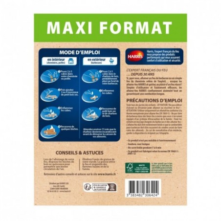 Les cubes 100% naturels Harris sont imprégnés de cire végétale qui garantit une prise de feu rapide. Ils ne contiennent aucun dérivé pétrolier, ne dégagent aucune mauvaise odeur, et ne laissent après combustion aucun résidu toxique. Idéal pour les feux intérieurs comme extérieurs.